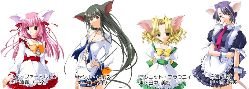 | ★Story ずっとず〜っと東にある大陸に不思議な学園があった。 制服にネコミミとシッポの付いた、その名も―― 「王立ネコミミ学園」 お嬢さまだろうと不良だろうと、もちろん教師も男も、みんなみ〜んなネコミミ姿。 そんなヘンテコ学園にやって来た、謎の転校生「ユイ・ファーミルトン」 例年以上に盛りあがる学園祭の準備期間に紛れるようにして現れた彼女は、 実はその耳も尻尾も本物という、正真正銘のネコミミ少女だった。 そんな秘密を知ってしまった主人公「橘 広海(たちばな・ひろみ)」 学園祭の最優秀団体に賞金が出るとあって、珍しくやる気になっていたのだが、 常識知らずの彼女に付きまとわれ、振り回されることに…… 個性豊かなキャラクターたち(ネコミミ付き)が繰り広げる、 楽しくえっちで騒がしい日々をアナタに!! ★キャラクター ![]() ★イベント ![]() ★4コマ漫画